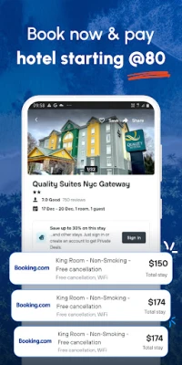 Our cheap hotels app provides more than a million hotels to choose from and hundreds of hotel booking sites to compare. We compare prices from the top providers for booking hotels like Airbnb, Booking com, Expedia, Agoda, Hotels com, Priceline, Trip advisor, Hotel tonight, Trivago, Hostelworld, Vacasa, Hometogo, etc. Booking hotels can be tough but booking your happy stays with our hotel app is easy.