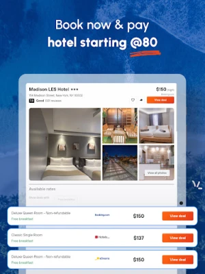 Booking hotels is more convenient now. Our Booking Hotels・Cheap Hotel App helps to compare 100s of hotel booking providers in a few seconds. In addition, we provide last minute hotel, motels, vacation rentals, etc., for your happy stays.